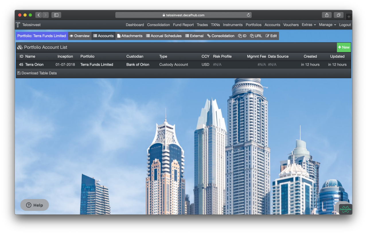 Let's click on the "New" button and create our first custody account at "Bank of Orion". The form should look like below before you save: